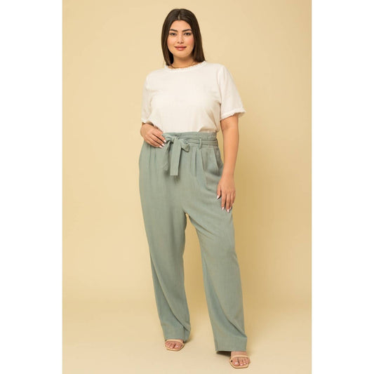 PLUS SIZE PAPERBAG WAIST TIE BELT WIDE LEG PANTS: SAGE / 1X