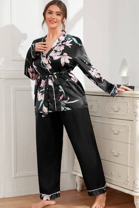 Plus Size Floral Belted Robe and Pants Pajama Set: Black / 1XL