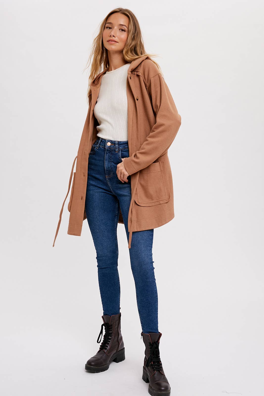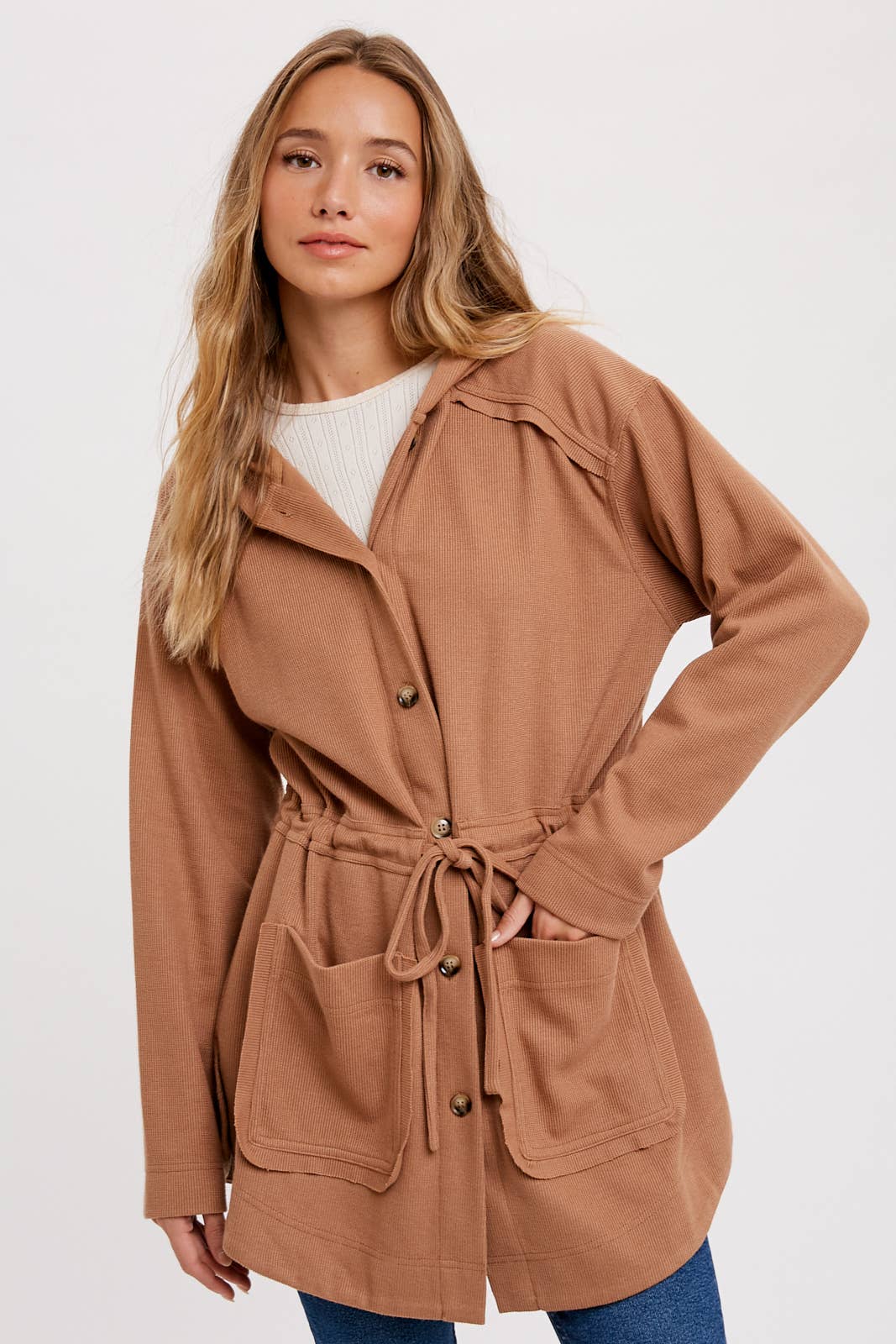 Ribbed knit jacket features a hooded neckline, drawstring waist, front patch pockets and a relaxed fit.