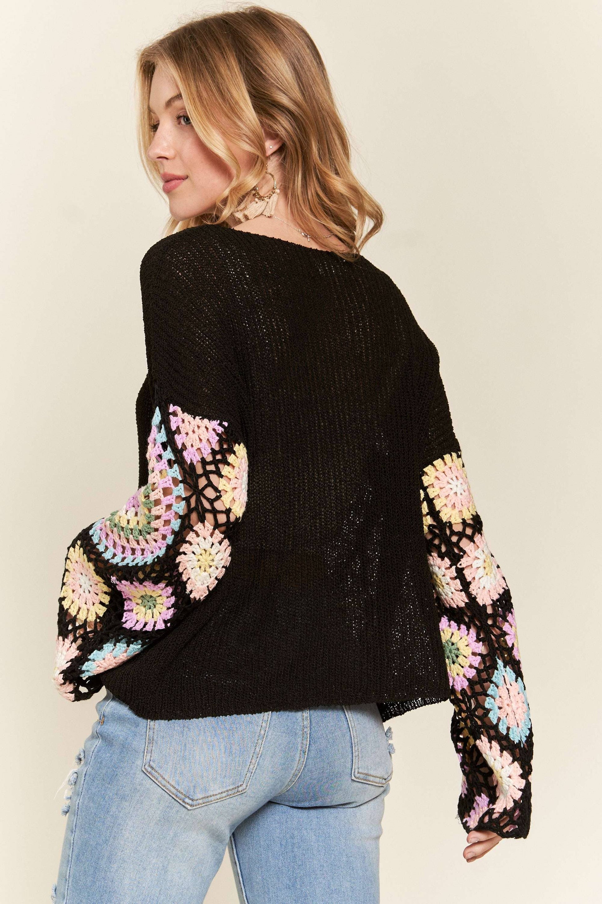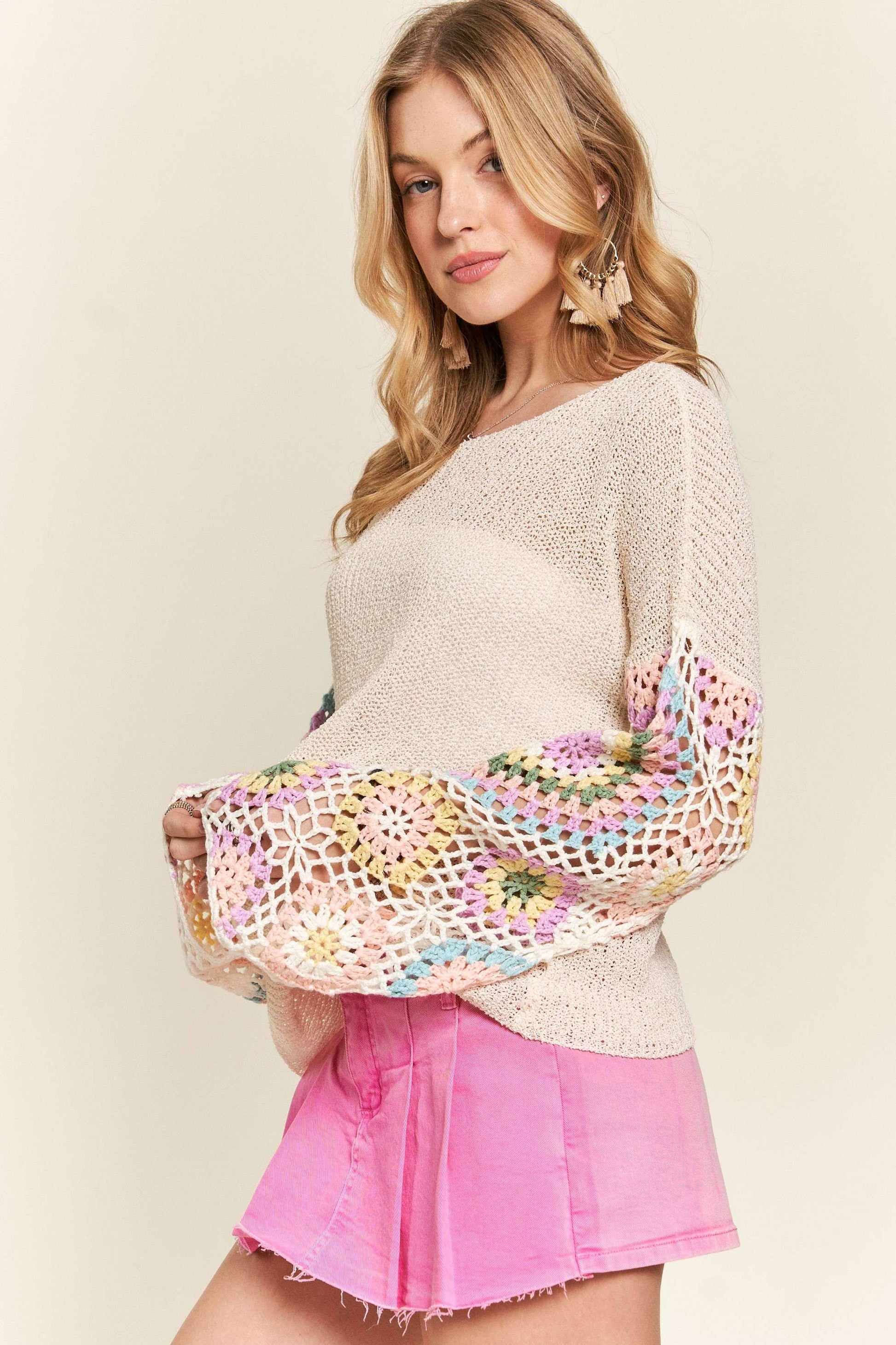 MULTI COLOR CROCHET SLEEVE LIGHTWEIGHT SWEATER KNIT TOP