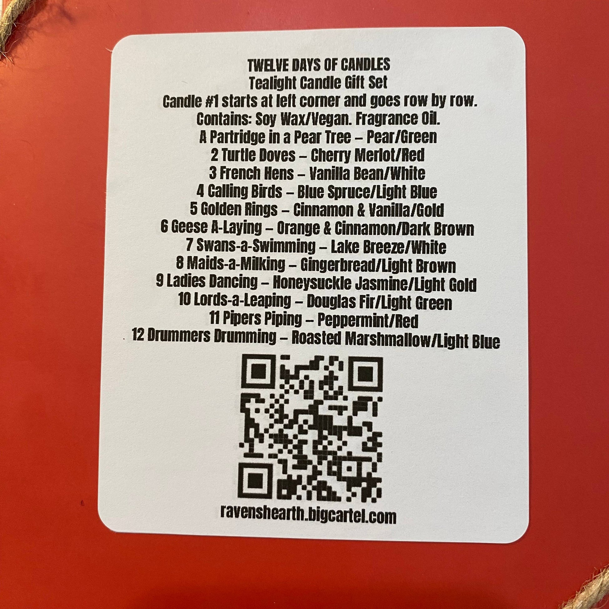 Contains 12 Tealight candles, each based on one of the “Twelve Days of Christmas.”