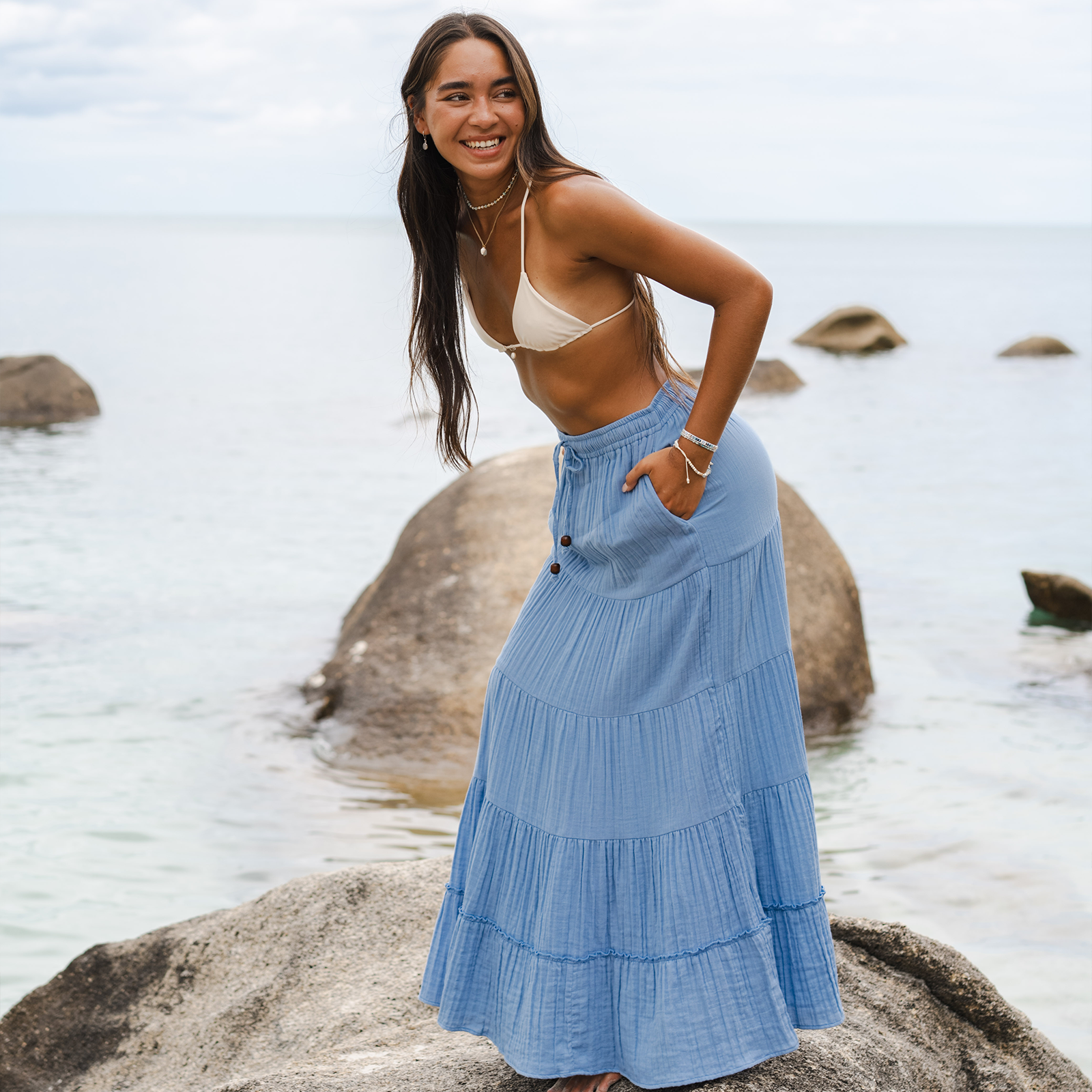 Indulge in island-inspired vibes with our tiered cotton skirt! Complete with a drawstring waist and convenient interior pockets, this skirt is your passport to easygoing style. Get the beach look and pair it with a tank top, or elevate the charm with a cruisin' crop for a seaside soirée.