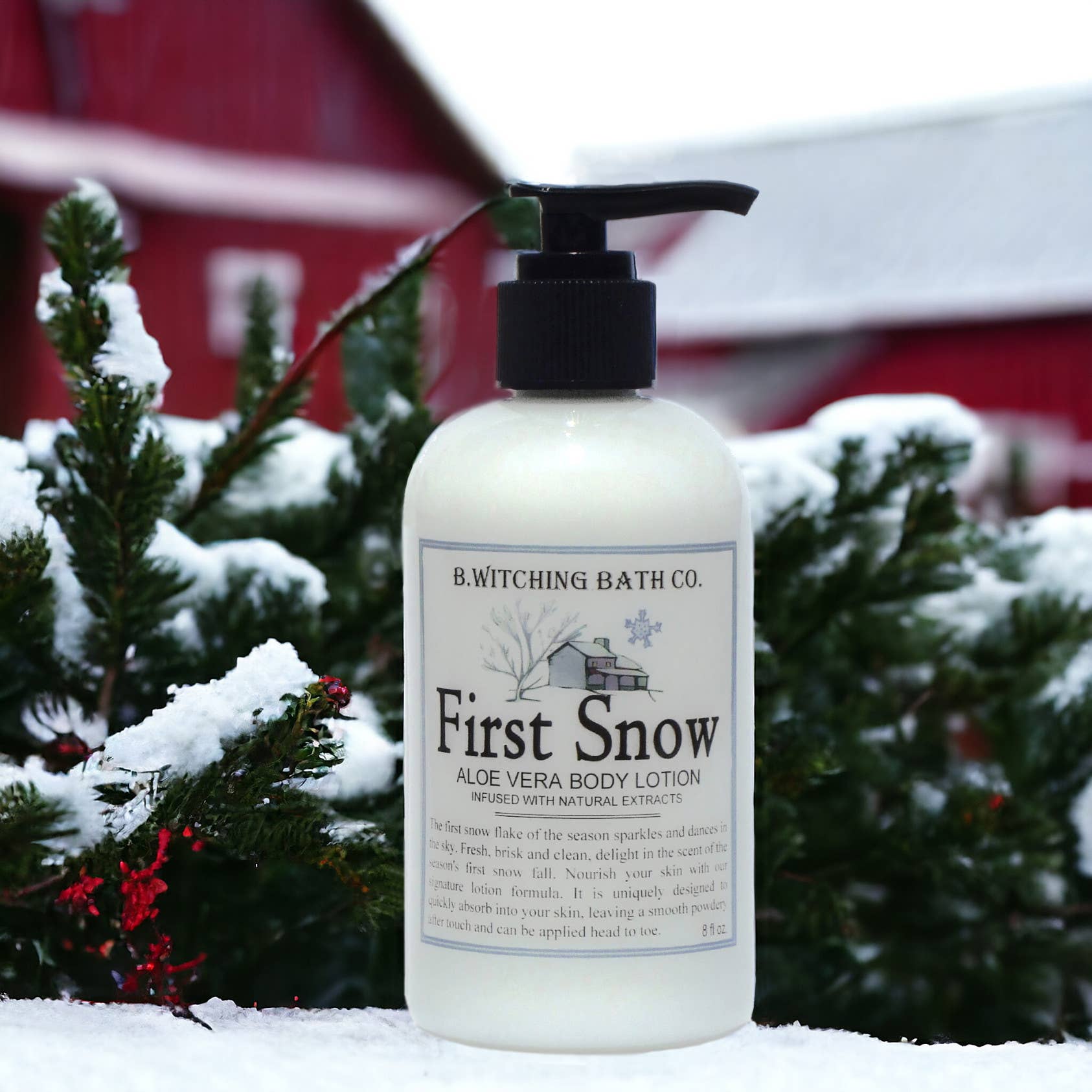 Winter's annual tradition. Delight in the scent of the season's first snow fall, refreshing, brisk and clean. A delightful way to celebrate the season. Our silky smooth signature lotion formula moisturizes your skin with aloe vera and Vitamin E. It is designed to leave a smooth powdery after touch, never a greasy feel. The fresh brisk scent will linger in your skin for hours. 8 fl. oz.