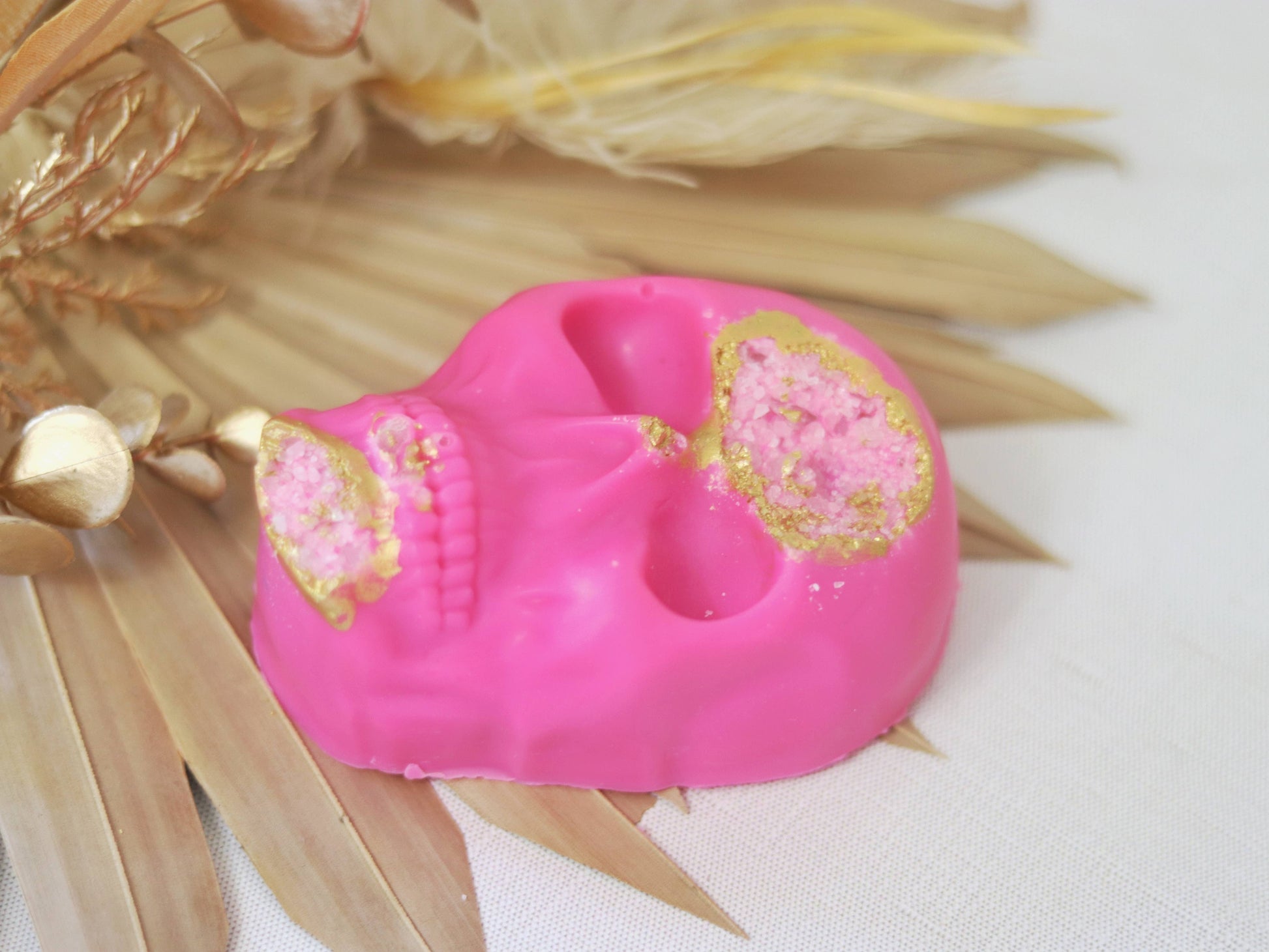 Brighten your day with the Gilded Quartz Skull soap, a vibrant and energizing addition to any artisan soap collection. Infused with the tropical fragrance of Pink Guava, this eye-catching neon pink skull soap is decorated with pink sea salt crystals and shimmering gold mica. Perfect for those who enjoy unique, handcrafted skincare products, this soap delivers a refreshing cleanse and a burst of uplifting aroma, making it an excellent choice for both personal use and gift sets.