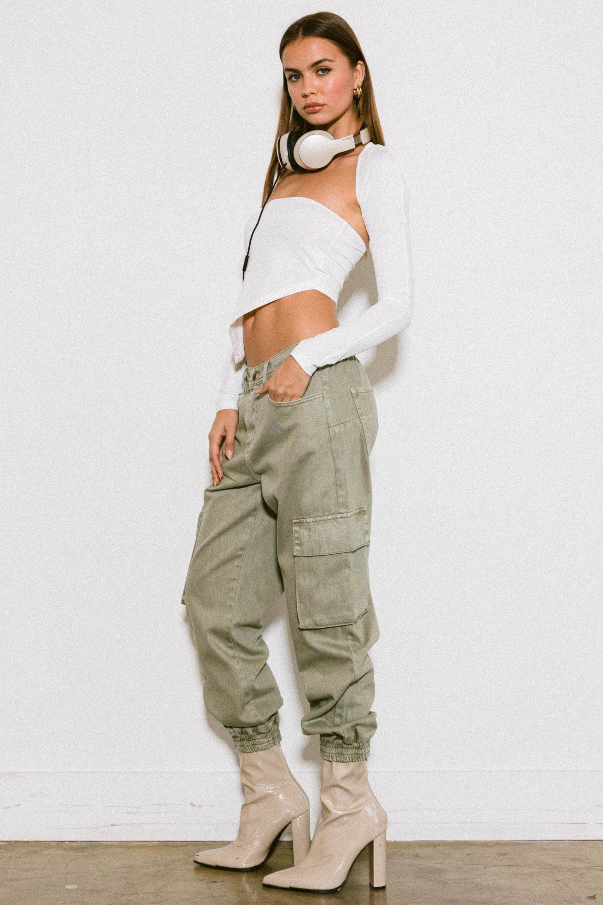 A pair of high-rise cargo jeans featuring wide cargo pockets, elastic leg openings, classic 5-pocket construction and zip-fly closure.