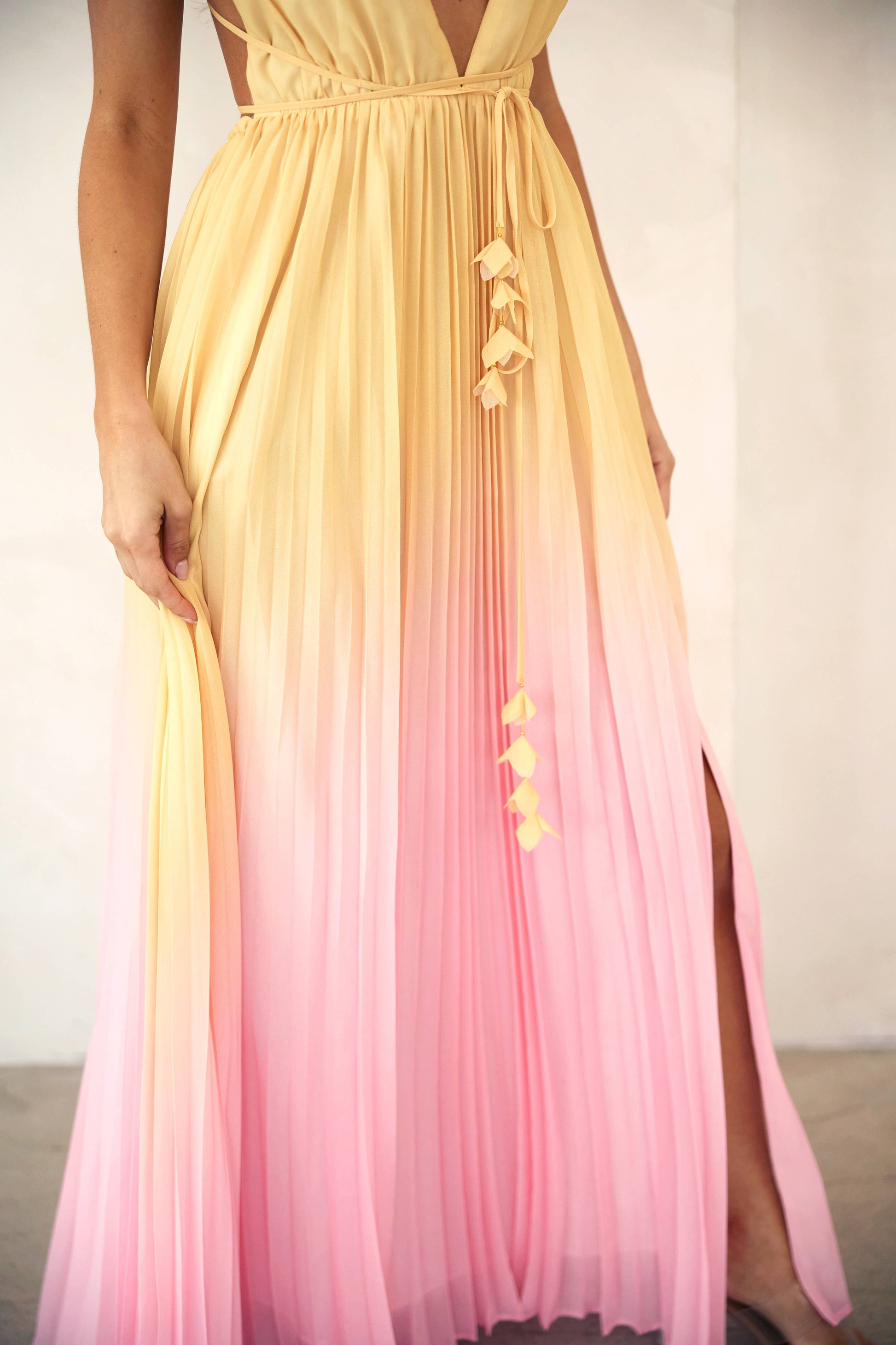 LD1225 Plunge Neckline Pleated Maxi Dress: Yellow Pink Ombre / Contemporary / L