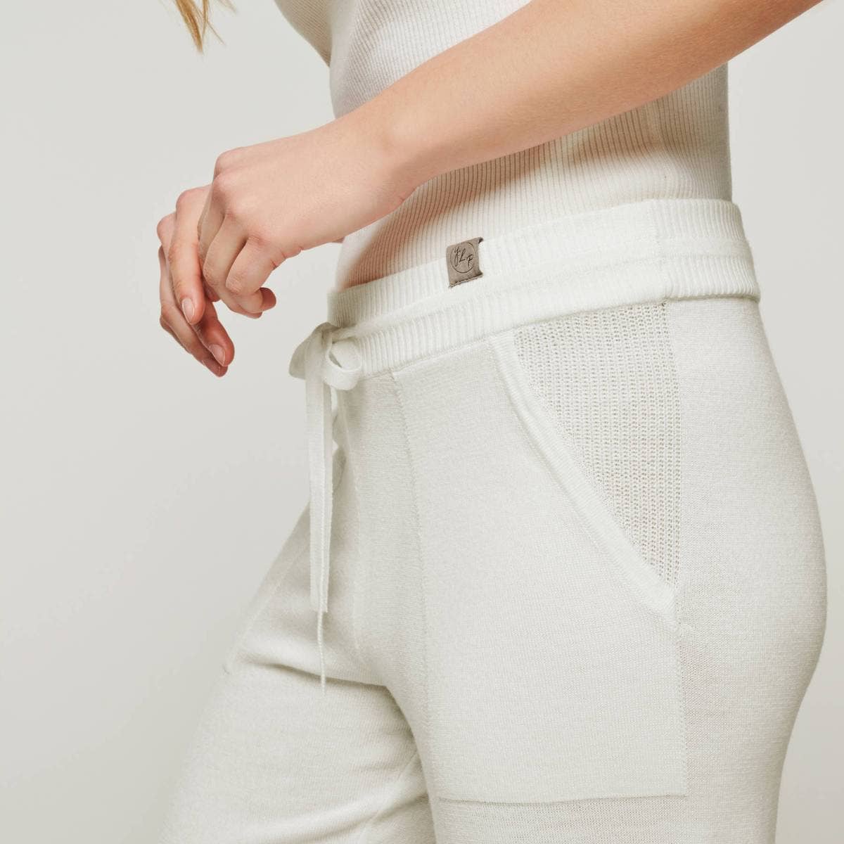 Stylish knitted loungewear set for women consisting of cardigan blossom, top blossom and lounge pants Bella. The elegant long cardigan made from Italian merino is a true classic and modern with piping on the back and ribbed sleeves. The knitted top with a nice insert at the edge is perfect for this. The stylish relaxation pants with knitted pockets and drawstring complete the look. This elegant ladies' loungewear setist created from renewable natural fibers.