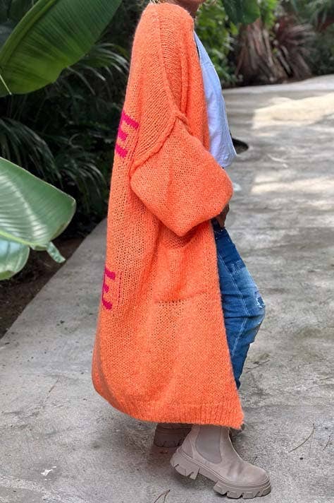 A knit cardigan featuring an open front, long sleeves, and a graphic design with "Love and Peace" text on the back.