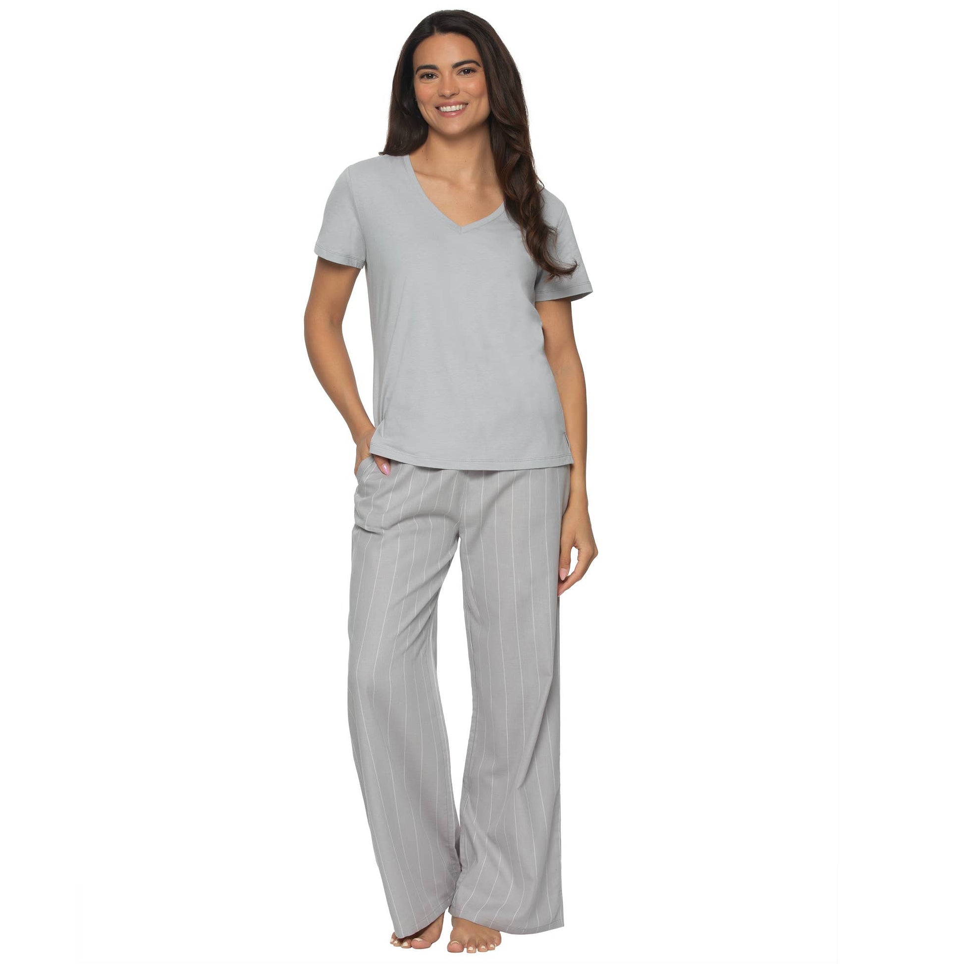 Mirielle Cotton Twill S/S V-neck and Pant PJ Set - Silver: Silver Sconce w White Pinstripe (SWP) / L