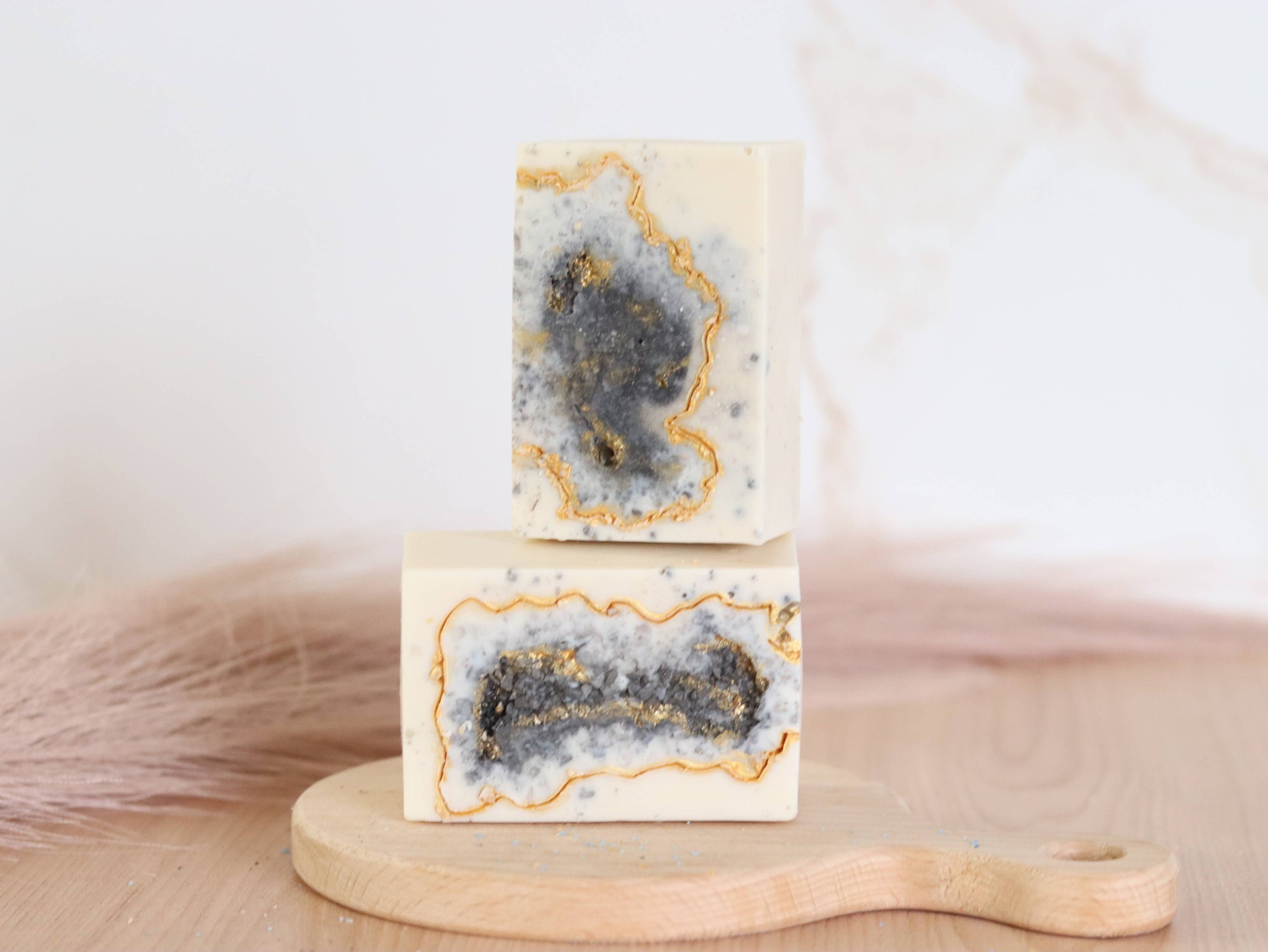 Our new crystal collection soaps are here! This Onyx soap is handcrafted with sea salt to create the perfect “geode” crystal formations. This soap is crafted with a nourishing oil blend that will cleanse and moisturize your skin to perfection.
