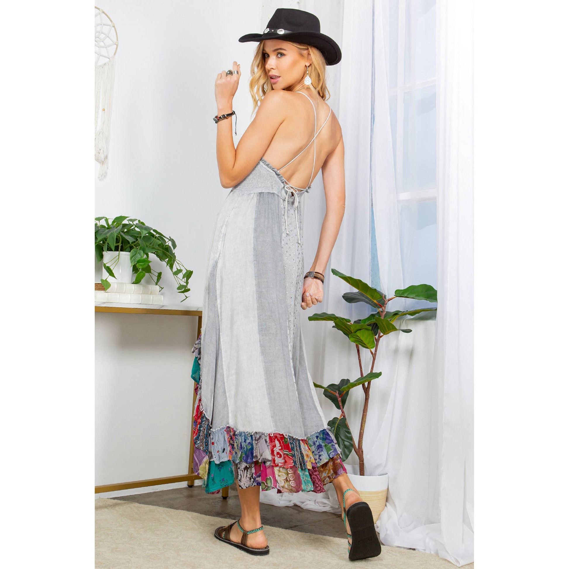 Embrace the sun-kissed whispers of summer in this captivating sundress, where embroidered patchwork meets vintage floral prints, weaving a tale of bohemian spirit. The smocked bodice flatters your figure and cinches your waist, accentuated by delicate frill detailing. An asymmetrical skirt adds a touch of playful movement, flowing down in layers of vibrant patchwork and blooming floral prints.